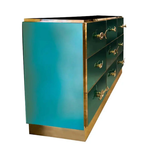 Bespoke Italian Art Deco Brass & Emerald Blue-Green Art Glass 9-Drawer Dresser Sideboard