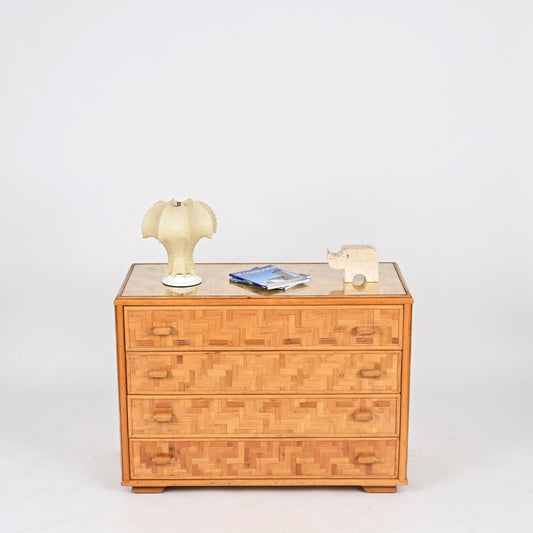 Mid-Century Italian Chest of Drawers – Rattan & Bamboo with Glass Top