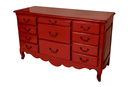 Deep Red French Provincial 11-Drawer Dresser with Brass Hardware