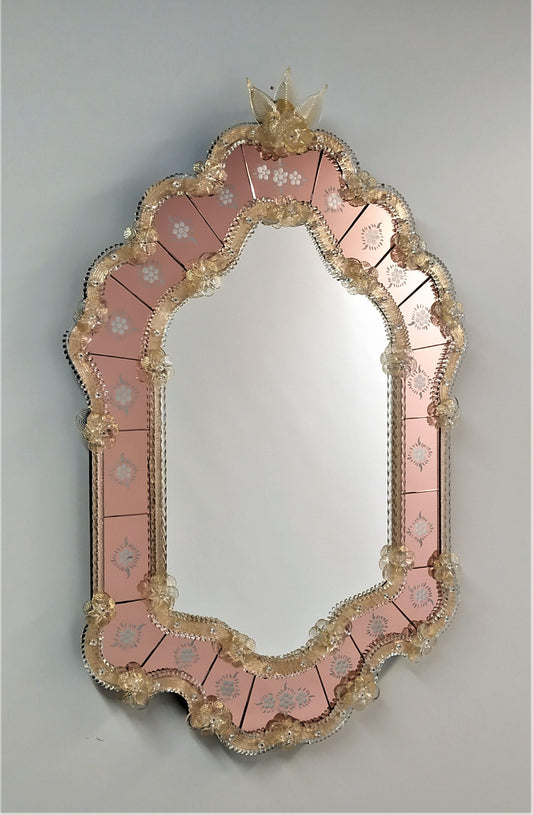 Navagero Murano Glass Wall Mirror – Golden Crystal & Pink-Toned Floral Etchings