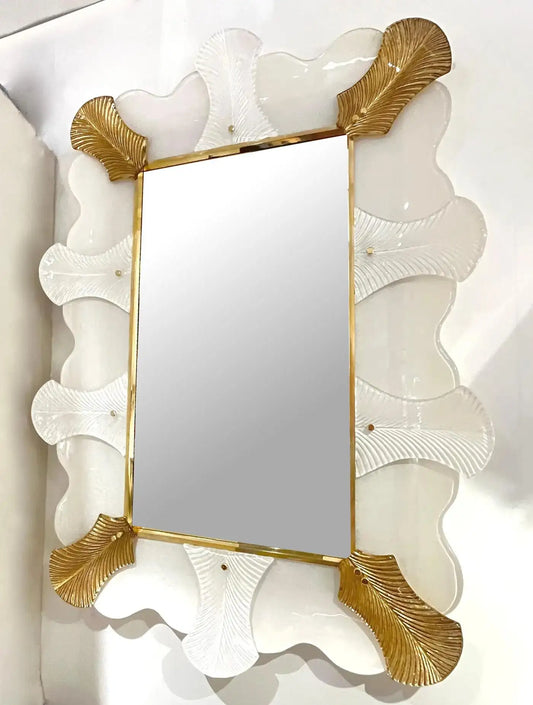 Art Deco Style Curved Leaf White Gold Murano Glass Brass Mirror