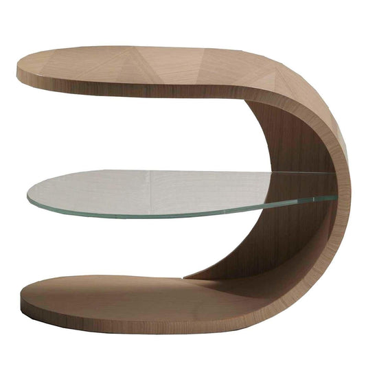 Iride Bedside Table – Curved Oak Design with Glass Shelf