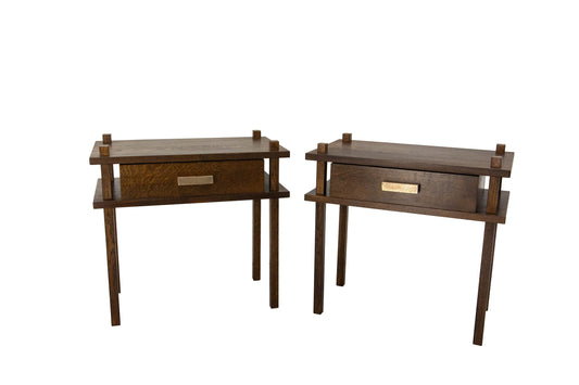 French Chalet Style Oak Nightstands – Pair with Bronze Handles