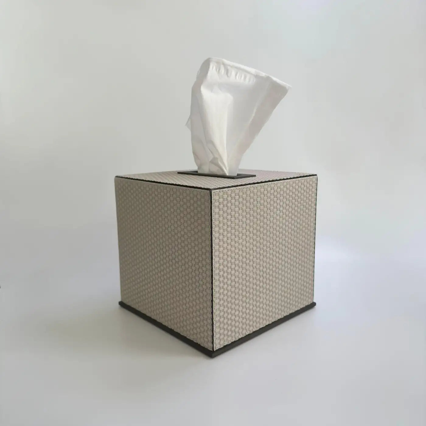This Giobagnara Firenze bathroom accessory collection, handcrafted in Italy, features a soap dispenser, toothbrush holder, and tissue box. Each item is adorned with taupe basketweave Italian leather paired with dark bronze metal hardware, exemplifying Giobagnara’s blend of modern design and artisanal craftsmanship. The leather, carefully applied by skilled Italian artisans, provides rich texture and a refined feel, while the bronze accents lend warmth and durability. The set has only been displayed and is in excellent condition.