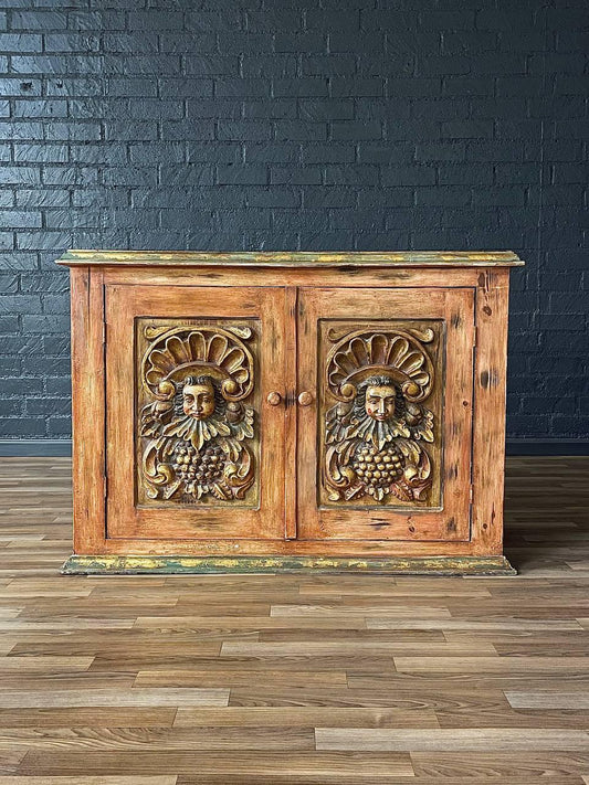 Rustic Spanish Colonial Hacienda Cabinet – Hand-Carved Faces & Floral Motifs