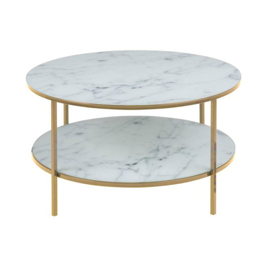 Alis Coffee Table – White Marble Look Glass Top, Gold Metal Frame