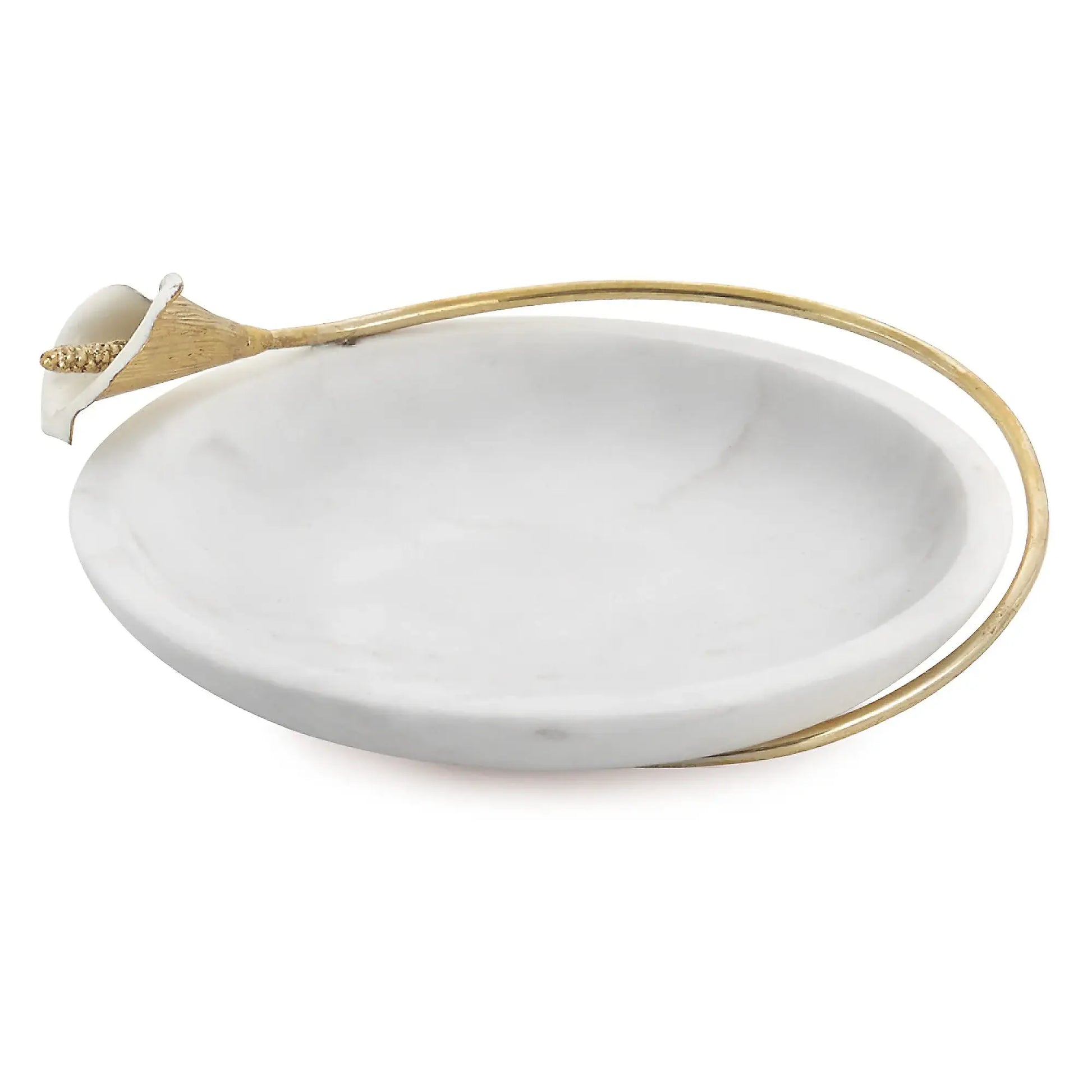 Celebrate organic beauty and artisanal elegance with this Calla Lily Marble Dish. Drawing inspiration from the elegant curvature of the calla lily flower, the dish combines a sculptural silhouette with luxurious materials. Meticulously crafted from marble, brass, and white enamel, it offers a refined centerpiece or serving accent. Whether used as a trinket tray, dessert plate, or decorative accent, this dish adds a romantic and timeless touch to your space.