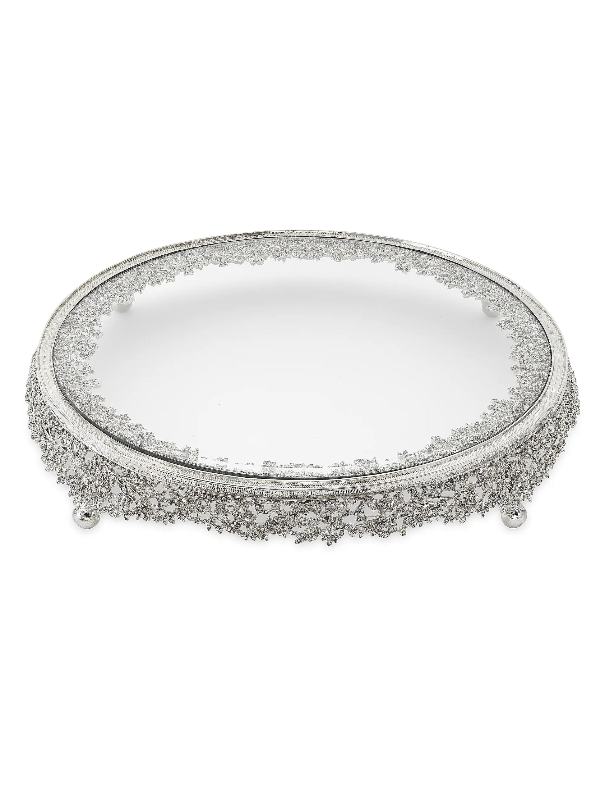 From the Isadora Collection. Inspired by nature, this contemporary cake plateau is crafted of silver-finished pewter in an intricate branch pattern and adorned with hand-set clear European crystals.