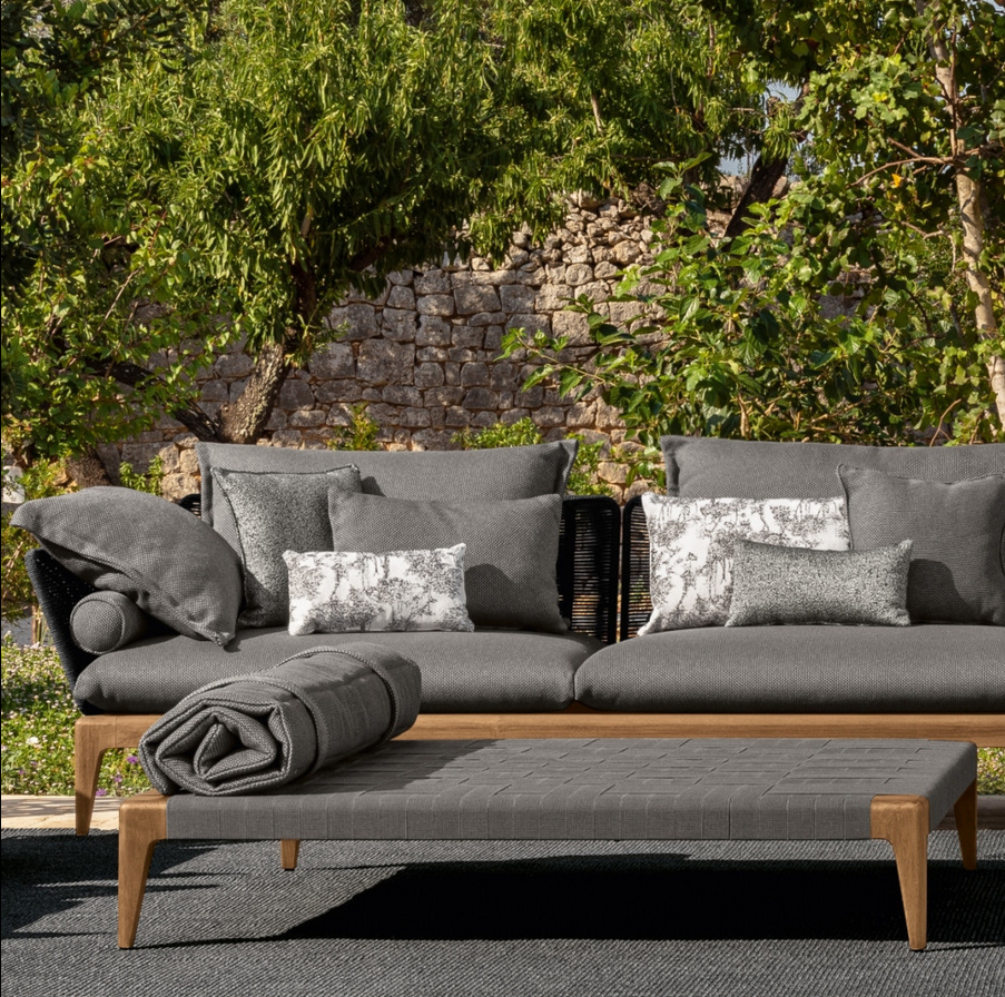 Crafted entirely from teak in a smoke finish, the structure boasts expert carving and a smooth, polished surface, accentuated by subtle curved corners. The cushions feature weather-resistant fabric carefully selected for its elegant and sophisticated appearance.