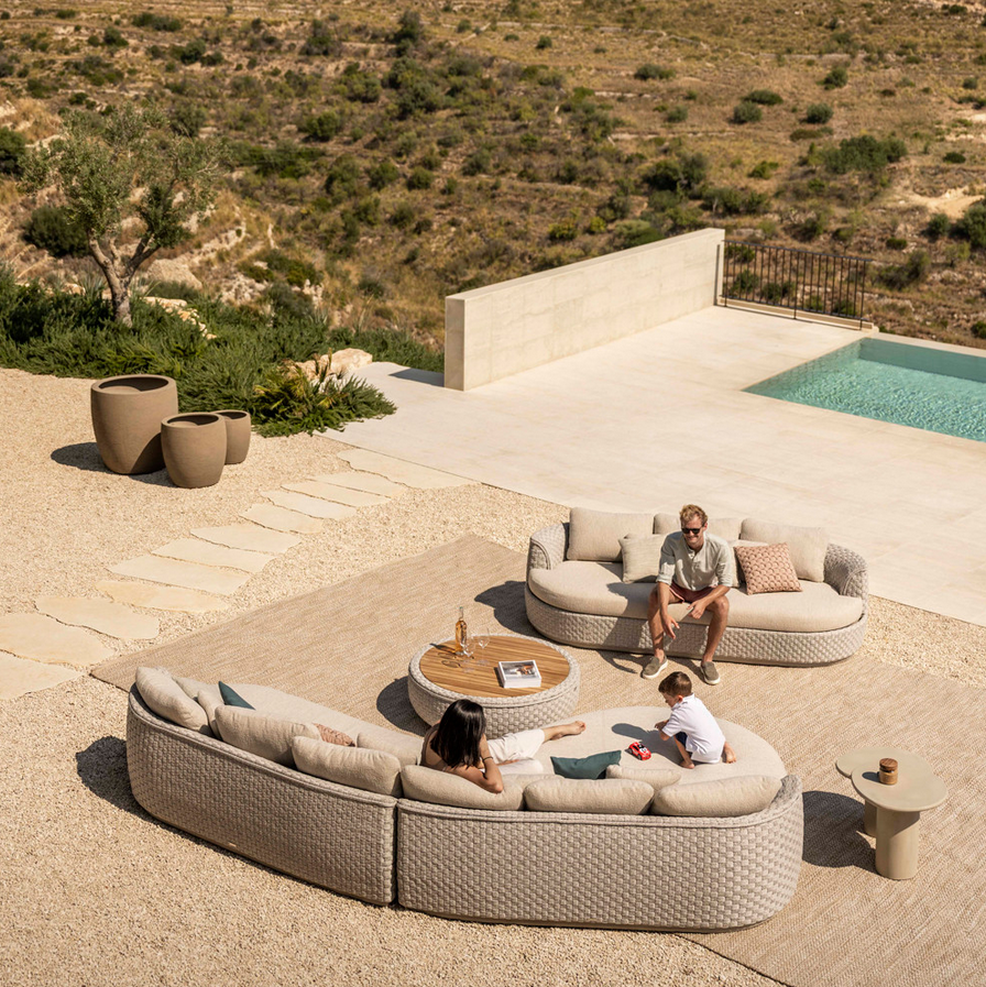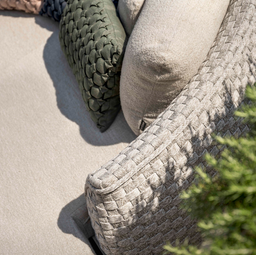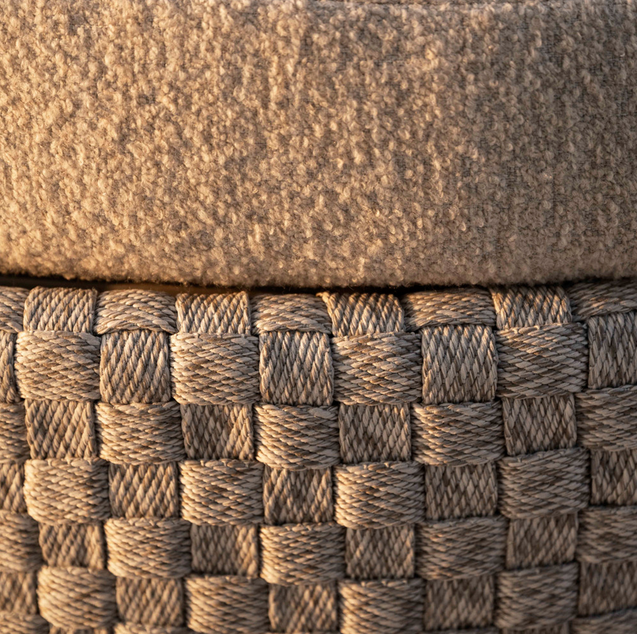 The signature element of the collection is its thick, hand-woven rope, crafted into a geometric pattern that adds texture and sculptural appeal. This soft, rounded form echoes the comfort of indoor lounging yet is built with durability and performance at its core.