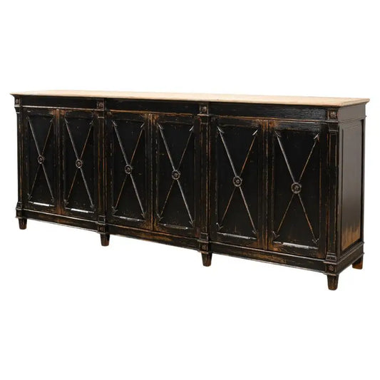 LONG DIRECTOIRE STYLE ANTIQUED BLACK BUFFET – 6-DOOR PINE SIDEBOARD