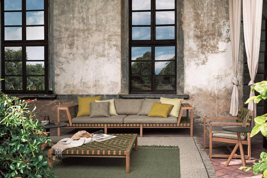Network 130 Outdoor Teak Sofa with Grey Polyester Belts and Hydro-Draining Cushions