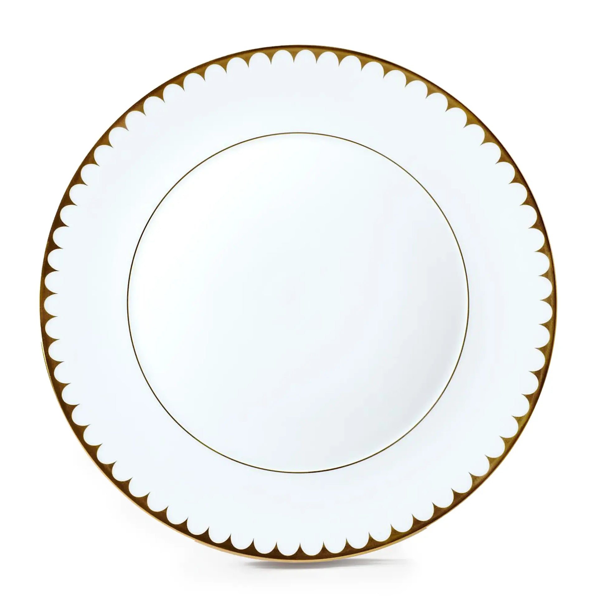 Inspired by the gentle waves of the Aegean Sea, this dinner plate features a graceful scalloped border and a refined scale-pattern texture. Each piece is made from premium Limoges porcelain and finished with hand-applied metallic trim in 24K gold or platinum. Elegant and timeless, it’s ideal for elevating everyday meals or formal dining occasions.