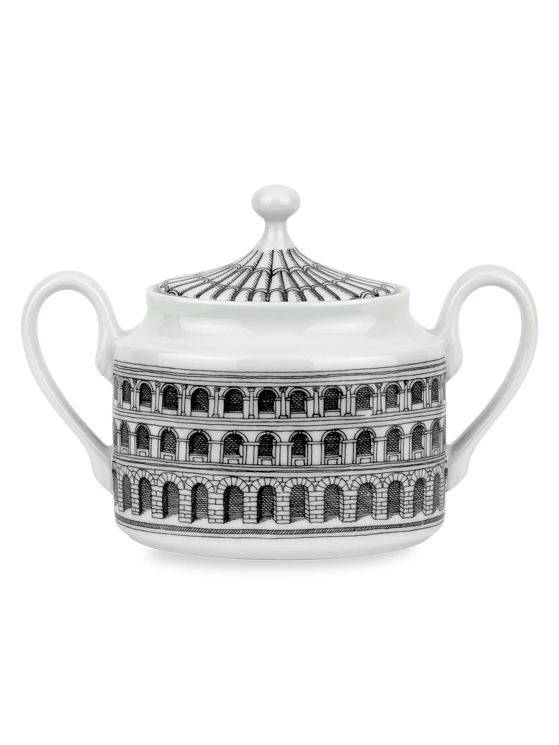 Designer Piero Fornasetti references Roman architecture in the design of this sugar bowl, loosely resembling the Roman Colosseum — an homage to his Italian heritage.