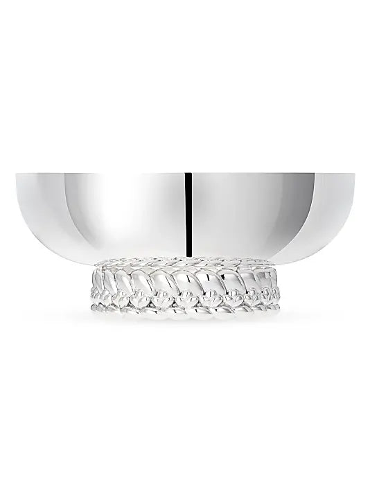 Christofle's Babylone collection is designed by Aurélie Bidermann. It establishes the Christofle know-how in the dining universe with strong and fashionable pieces and reflects the rise of the natural bond that integrates natural shapes or materials into its interior to remain connected with nature. This silver-plated bowl resting on a round braided base has multiple uses: It can hold sweets and fruit, serve as an aperitif bowl, or as a pretty decorative object.
