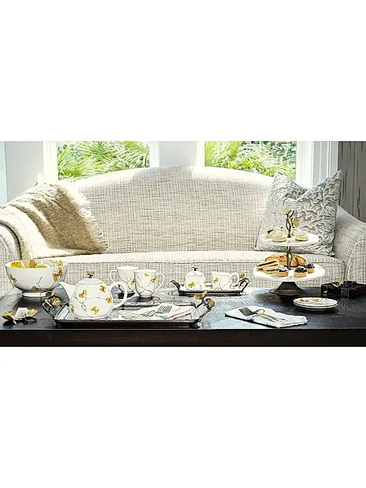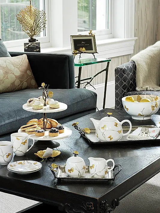 From the Butterfly Ginkgo Collection. The Butterfly Ginkgo Collection celebrates the representation of flora as fauna. Michael's fascination with a particular type of ginkgo tree, the ginkgo Biloba, or "Butterfly ginkgo", which grows with a double leaf reminiscent of a butterfly's wings, gave rise to a fantasia image of the plant. The pieces in the collection are a tour de force of Indian craft and capture the poetic spirit that is so deeply indicative of Michael's work.