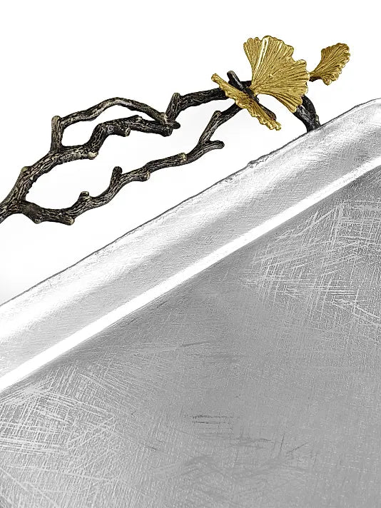 From the Butterfly Ginkgo Collection. Michael Aram’s handcrafted serving tray is rendered in solid brass with sculpted branch handles depicting the Ginkgo Biloba, a fascinating tree whose double-leaves are reminiscent of a butterfly’s wings.
