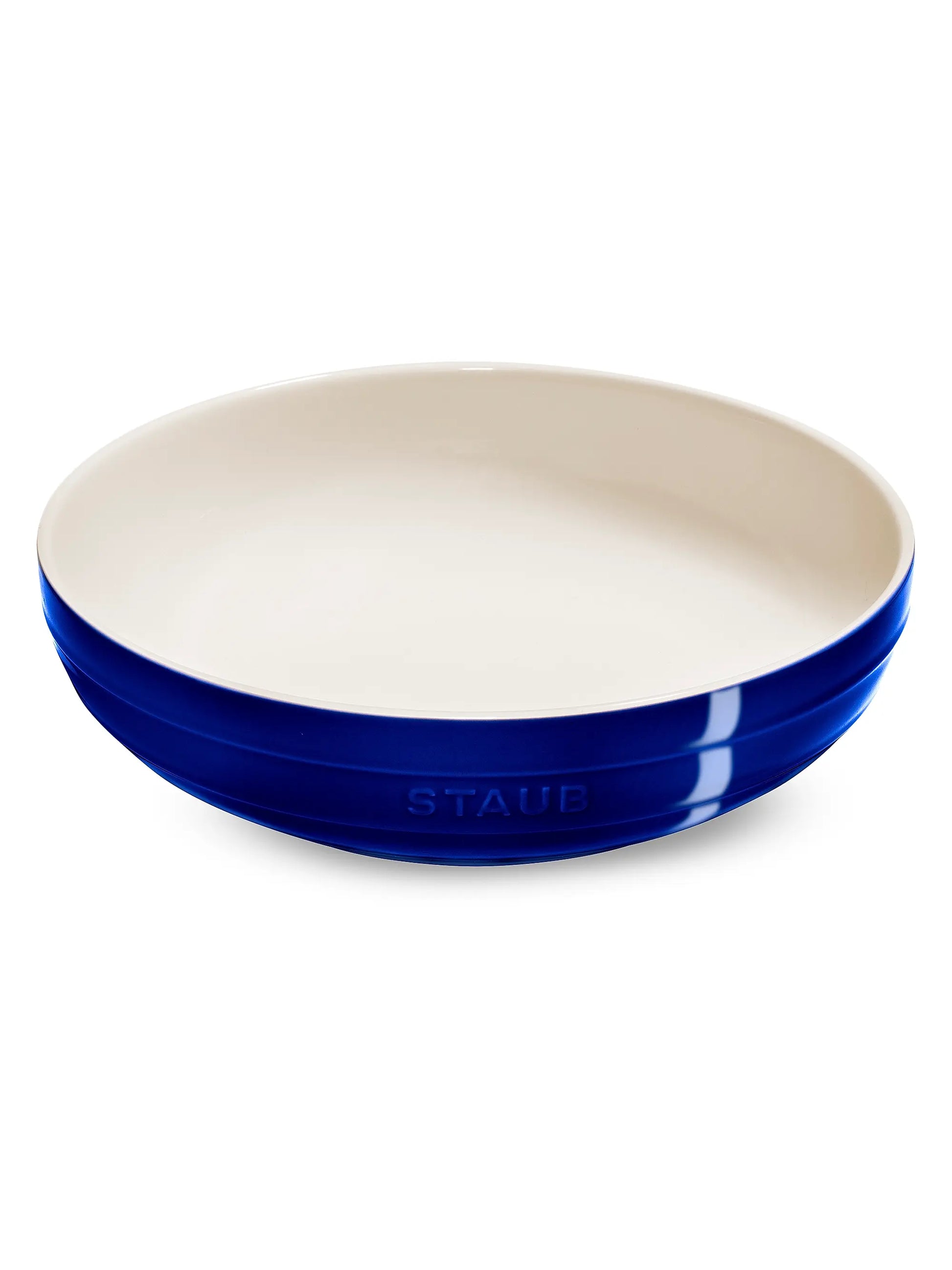 Versatile bowls for prepping, sharing, serving, mixing and more. Let elegance take shape with the newest additions to our stoneware serveware collection: A versatile 11-inch shallow serving bowl and a set of 2 nestable mixing bowls. The go-to choice for serving, mixing and more, these sophisticated stunners will transform your kitchen and are perfect for casual entertaining or elegant dinner parties. The versatile 11-inch shallow serving bowl features a wide base and low sides perfect for serving sides, plating up pasta, risotto, and brothy stews, and keeping on the counter as a fruit bowl. The nestable mixing bowls feature higher sides for whisking and stirring with less mess. These hardworking bowls can be used to prep ingredients or share snacks at the table. Proof bread, serve hearty salads, mix batter, and portion ingredients for every meal of the day. The elegance and functionality of Staub ceramics goes from freezer to oven to table. The glass porcelain finish matches all Staub cast iron to mix perfectly at the table. Oven and broiler safe up to 570°F, ceramics can also be used in the microwave and are dishwasher safe, as well as highly scratch, impact, and thermal shock resistant.
