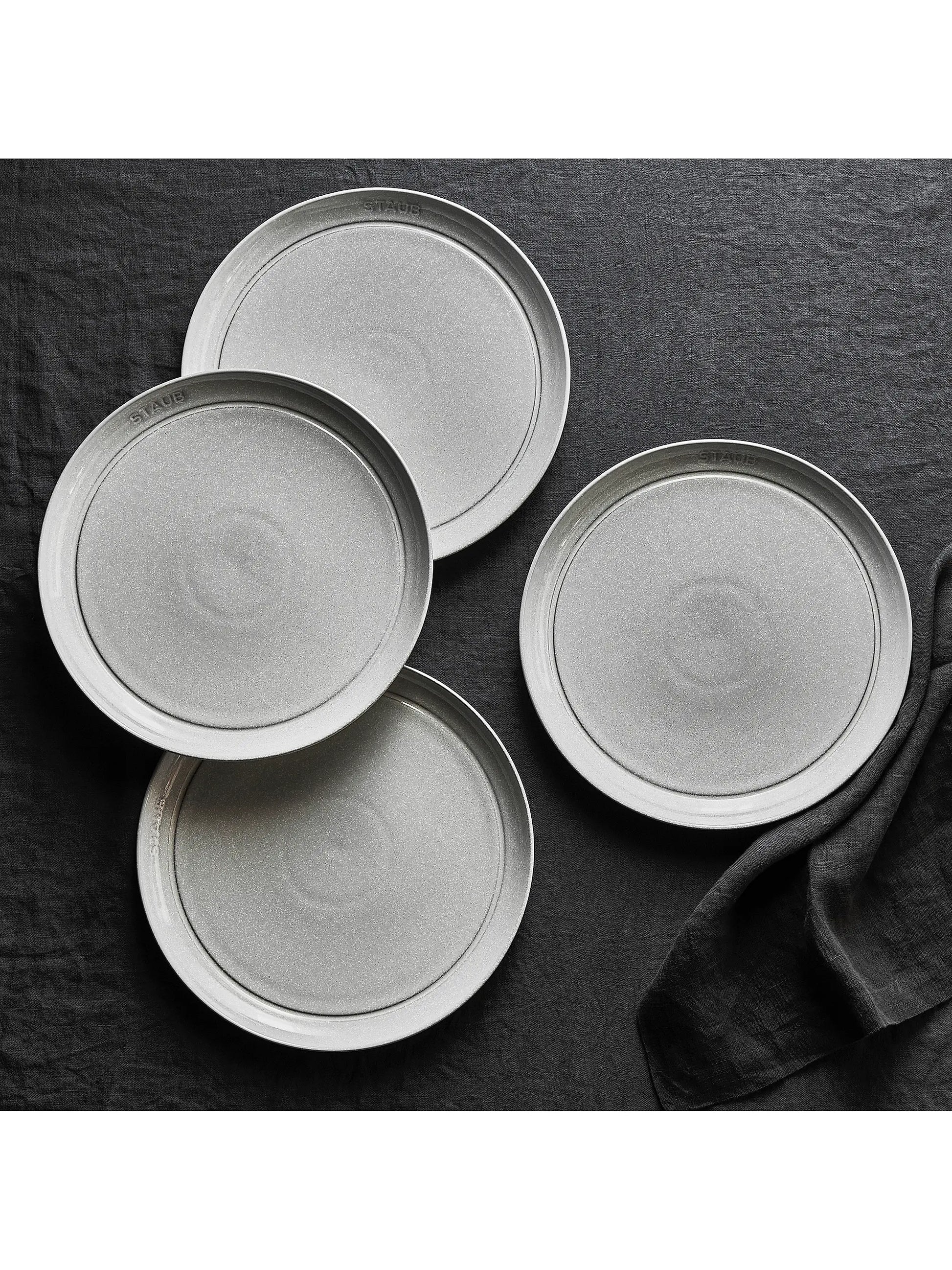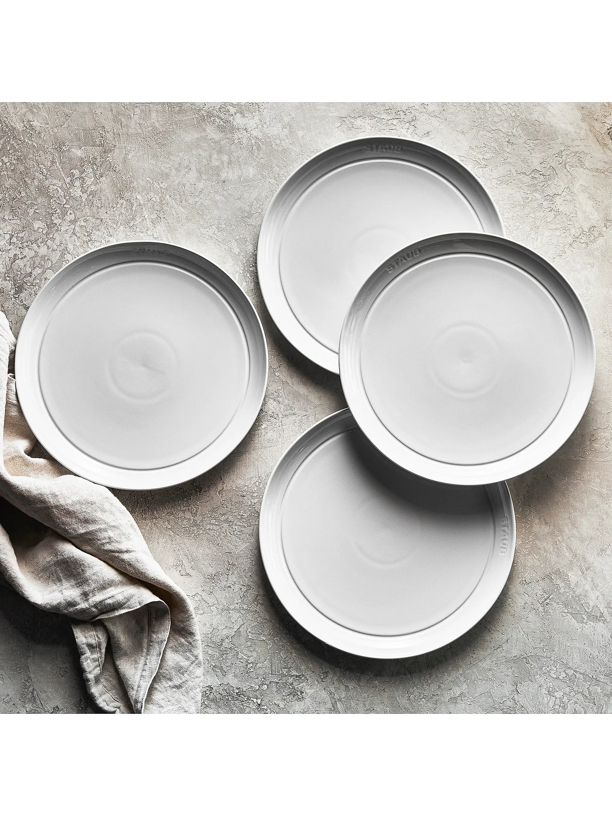 Bring timeless elegance and durability to your table with this four-piece set of 10-inch dinner plates in the White Truffle tone. Made from high-quality stoneware with a vitreous glass porcelain-enamel finish, these plates resist scratches and thermal shock, making them ideal for both everyday meals and special occasions. Moisture-resistant and stackable, they combine practicality with style, and are safe for use in the microwave and dishwasher.