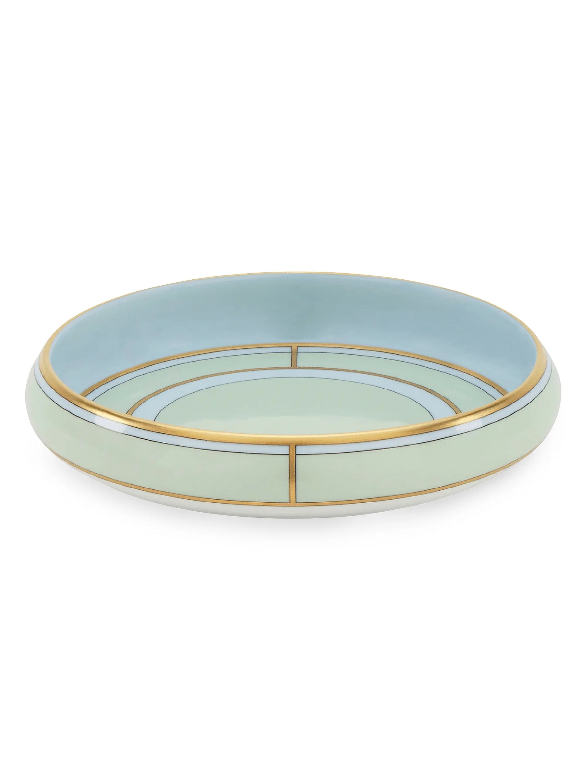 From the Diva Collection. The Ginori 1735 round change tray features a distinctive pastel decoration with gold threading, offering versatility as both a chic storage solution for small valuables and a stylish serving dish for hors d'oeuvres. Packaged in an exclusive luxury box, this piece makes a perfect gift for design enthusiasts seeking elegance in both function and presentation.
