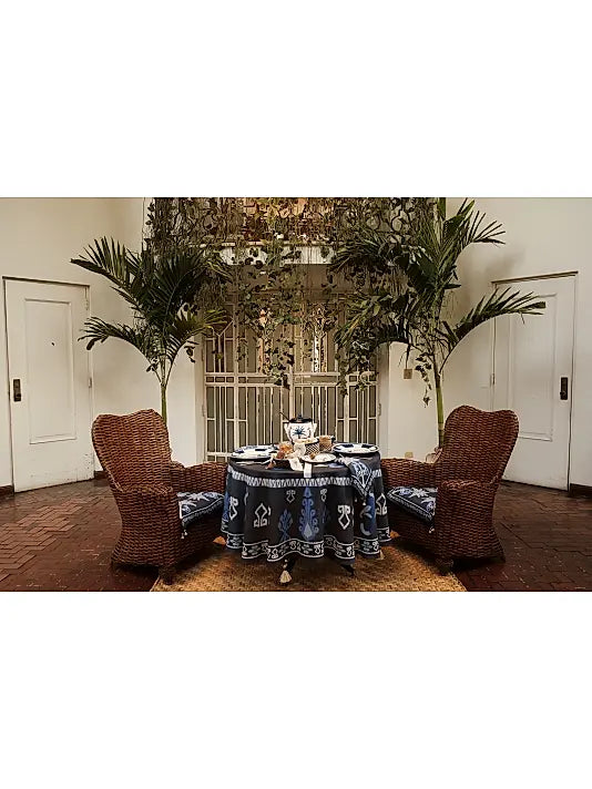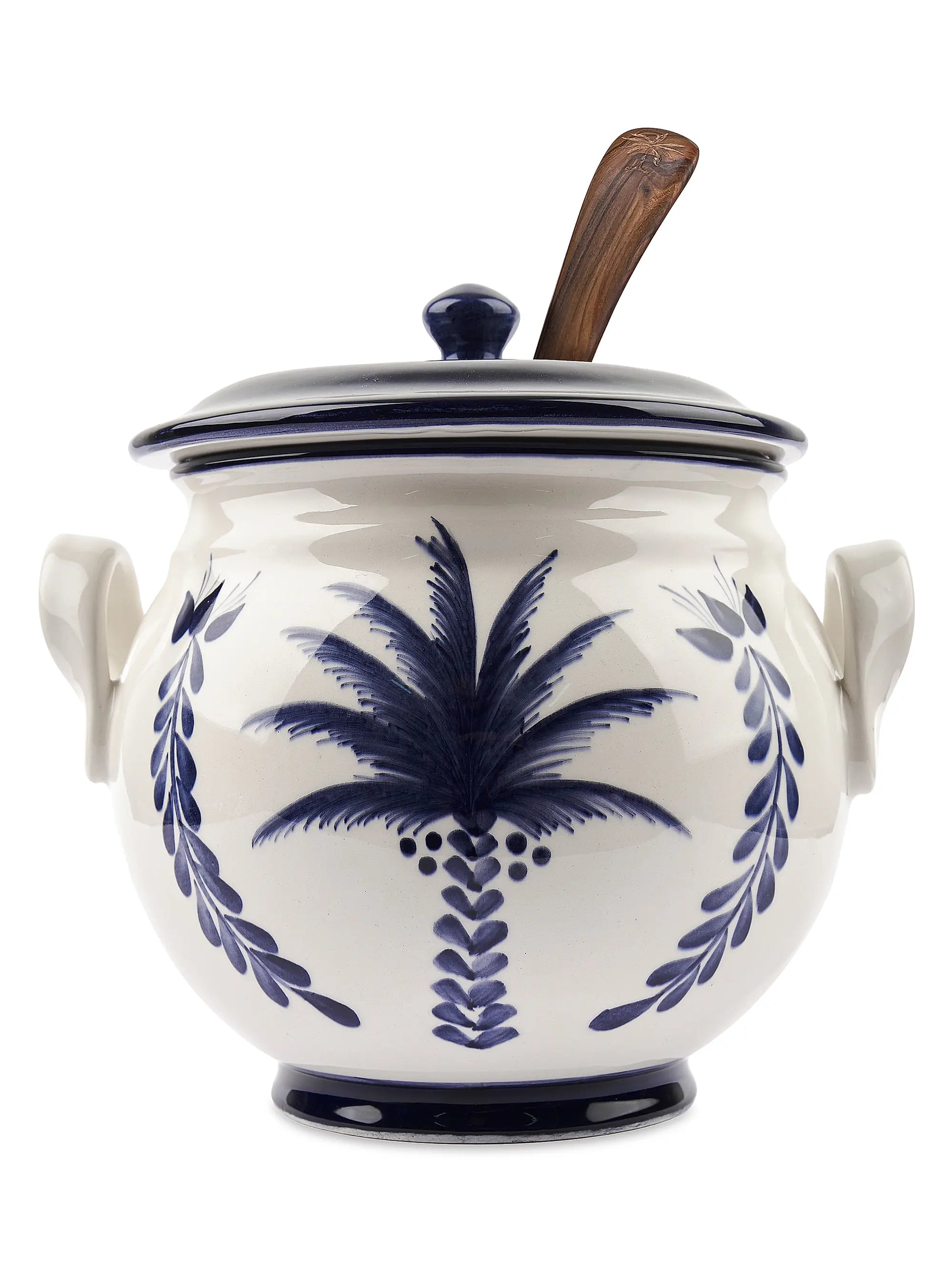 From the Entre Rios Collection. Inspired by Colombia's rich history of using palm fiber, this collection is designed to invoke ancient legends and lush jungles. This lidded ceramic soup pot includes a wooden ladle and is hand-painted with the beautiful Palma de la Cera.