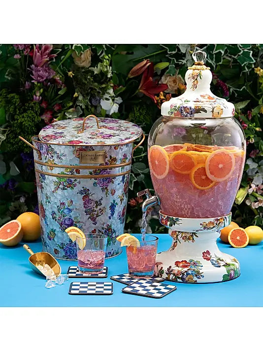 From the Flower Market Collection. Spend more time enjoying guests and less time running out for refills with the MacKenzie-Childs Flower Market Beverage Hostess. Featuring an enamel lid decorated with hand-applied Flower Market transfers, this charming accessory is generously sized to hold three gallons. The glass dispenser is finished with a stainless-steel spout.