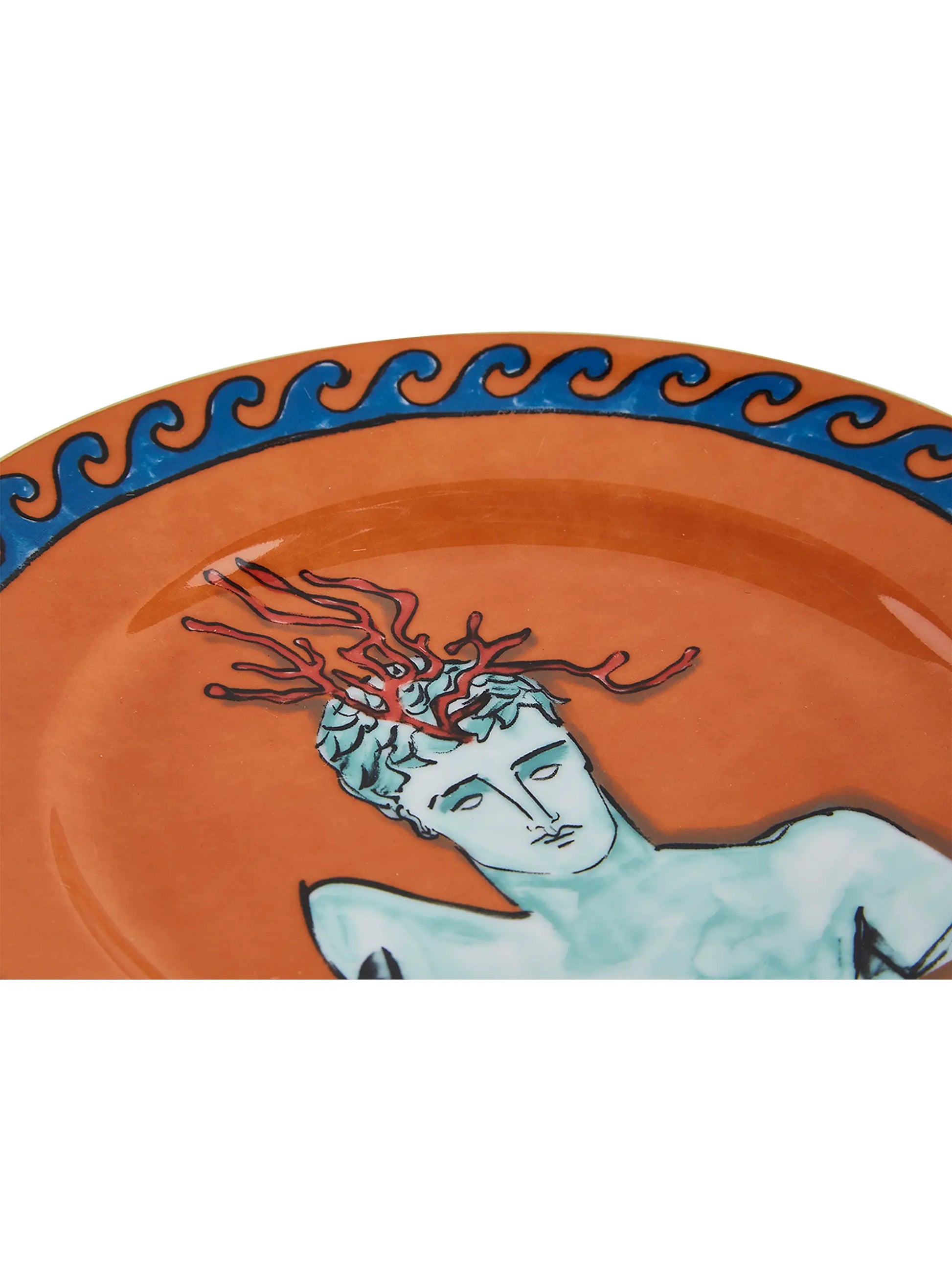 Bring myth and color to your table with this vibrant dessert plate from the Il Viaggio di Nettuno collection. The deep, fiery orange background sets the stage for Neptune’s marine motif, framed by rhythmic blue waves and highlighted with delicate gold threading. Crafted in fine porcelain, this plate blends storytelling and elegance—perfect for desserts, fruits, or as a decorative accent in themed table settings.