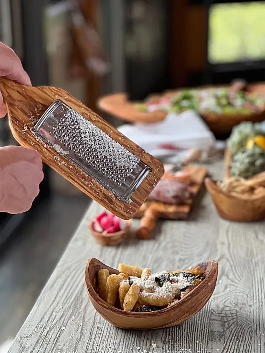 From the center of the table, this bowl's bold grain and rich color, adds an eye-catching background for everything from tossed greens to pastas. Artisans from Umbria, Italy, shape the bowl from Italian olivewood, showcasing the dramatic variations in tone and pattern that make each one of a kind. Please note that each piece will vary in size and shape due to its handmade nature.