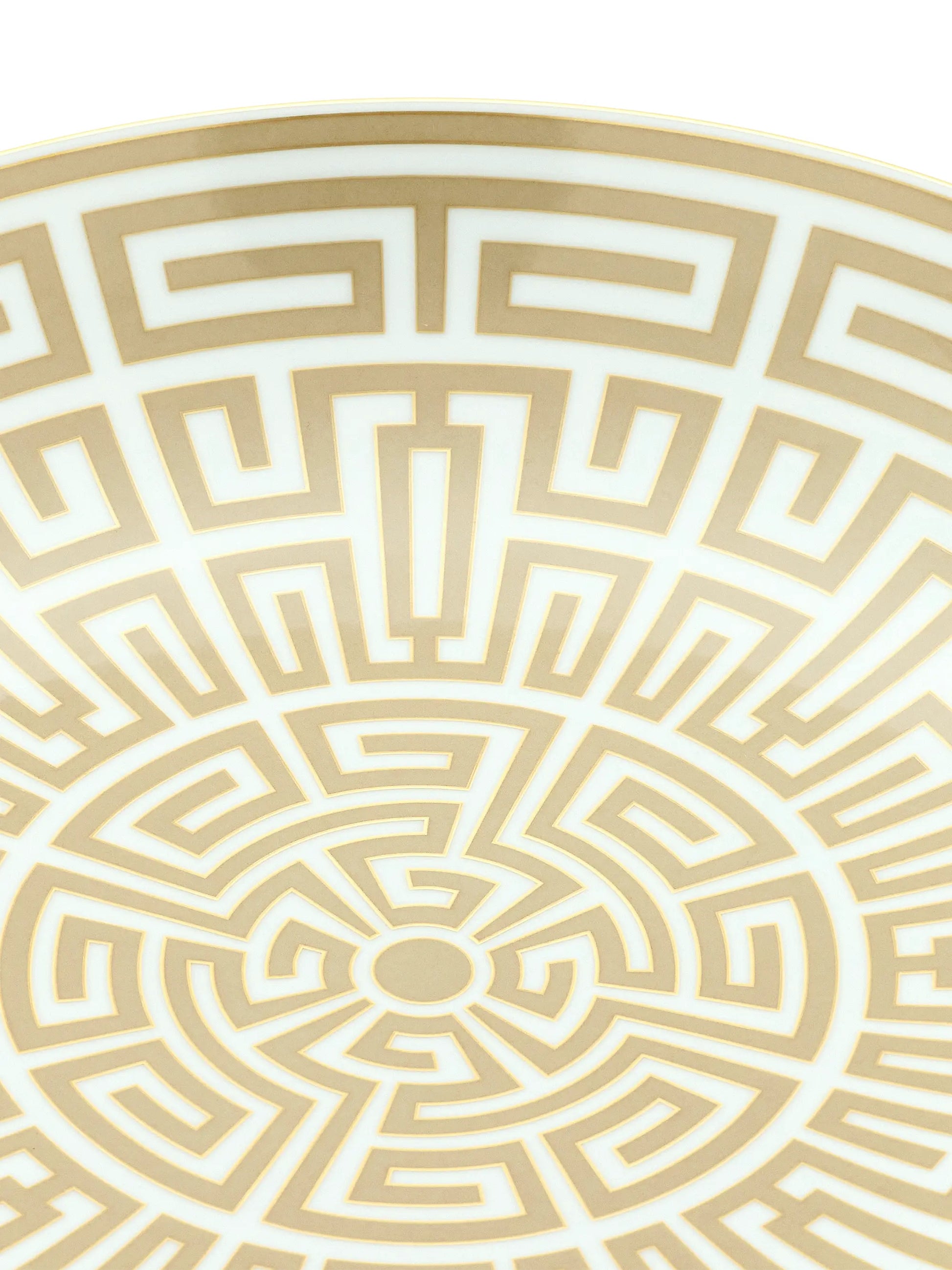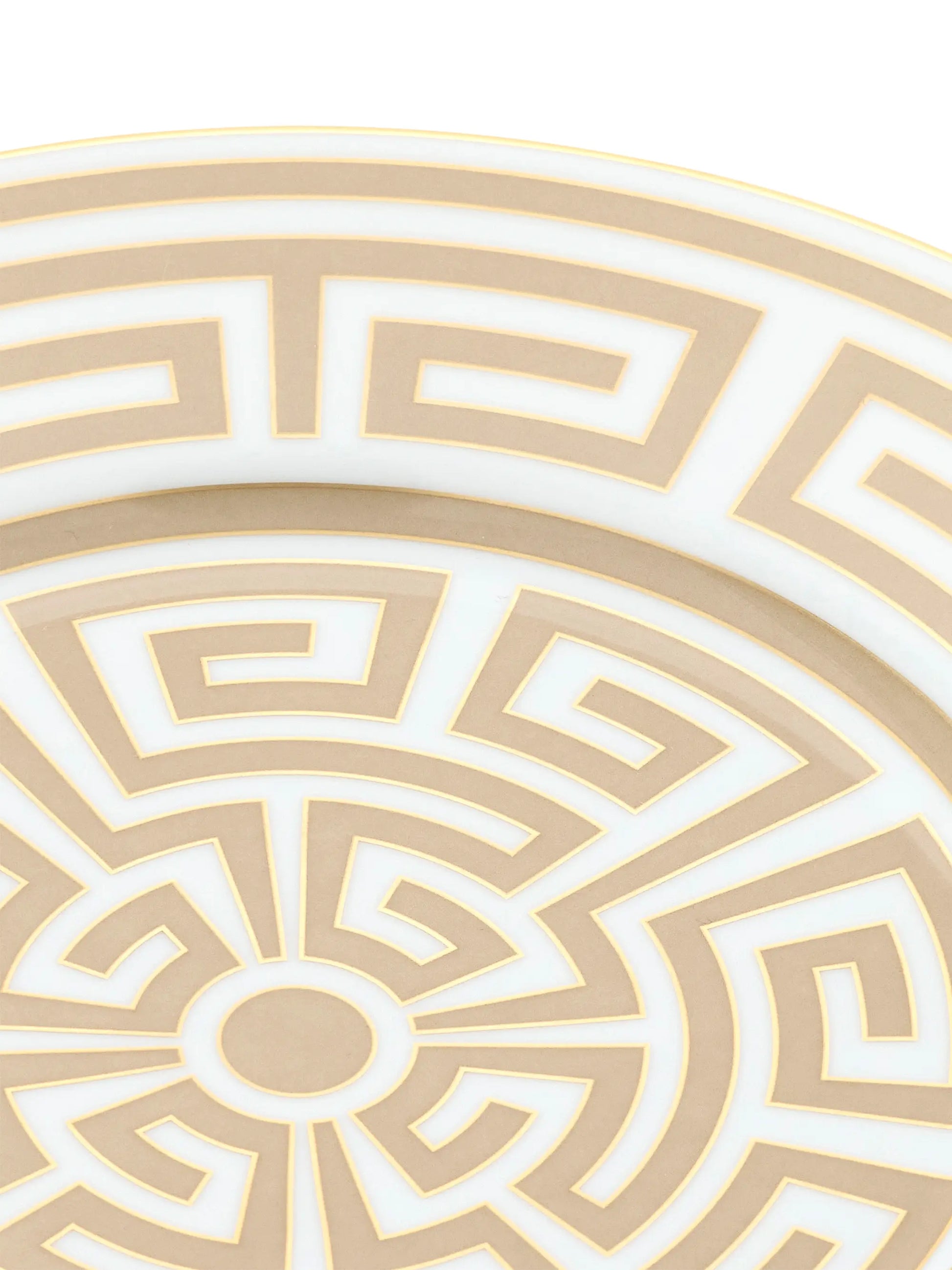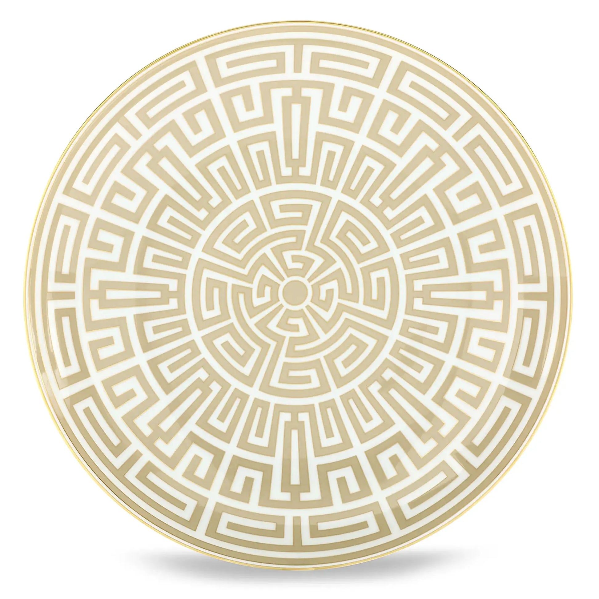 Refine your dining presentation with this Labirinto flat plate in a soft Cachemire tone. Crafted in high-quality porcelain, it features a labyrinth-inspired geometric design accented with gold threading that subtly catches the light. The elegant pattern evokes movement and depth while maintaining balance and sophistication.