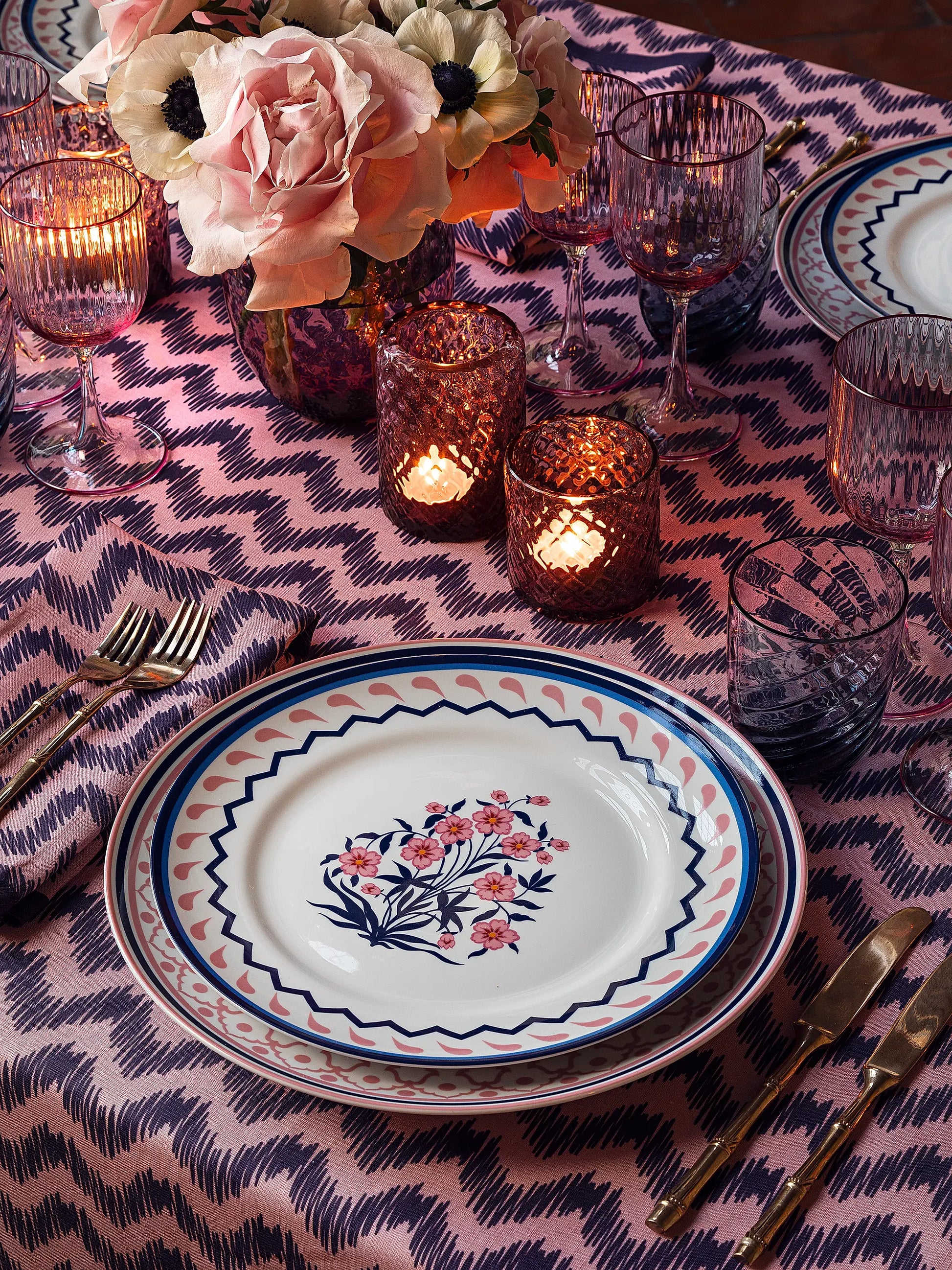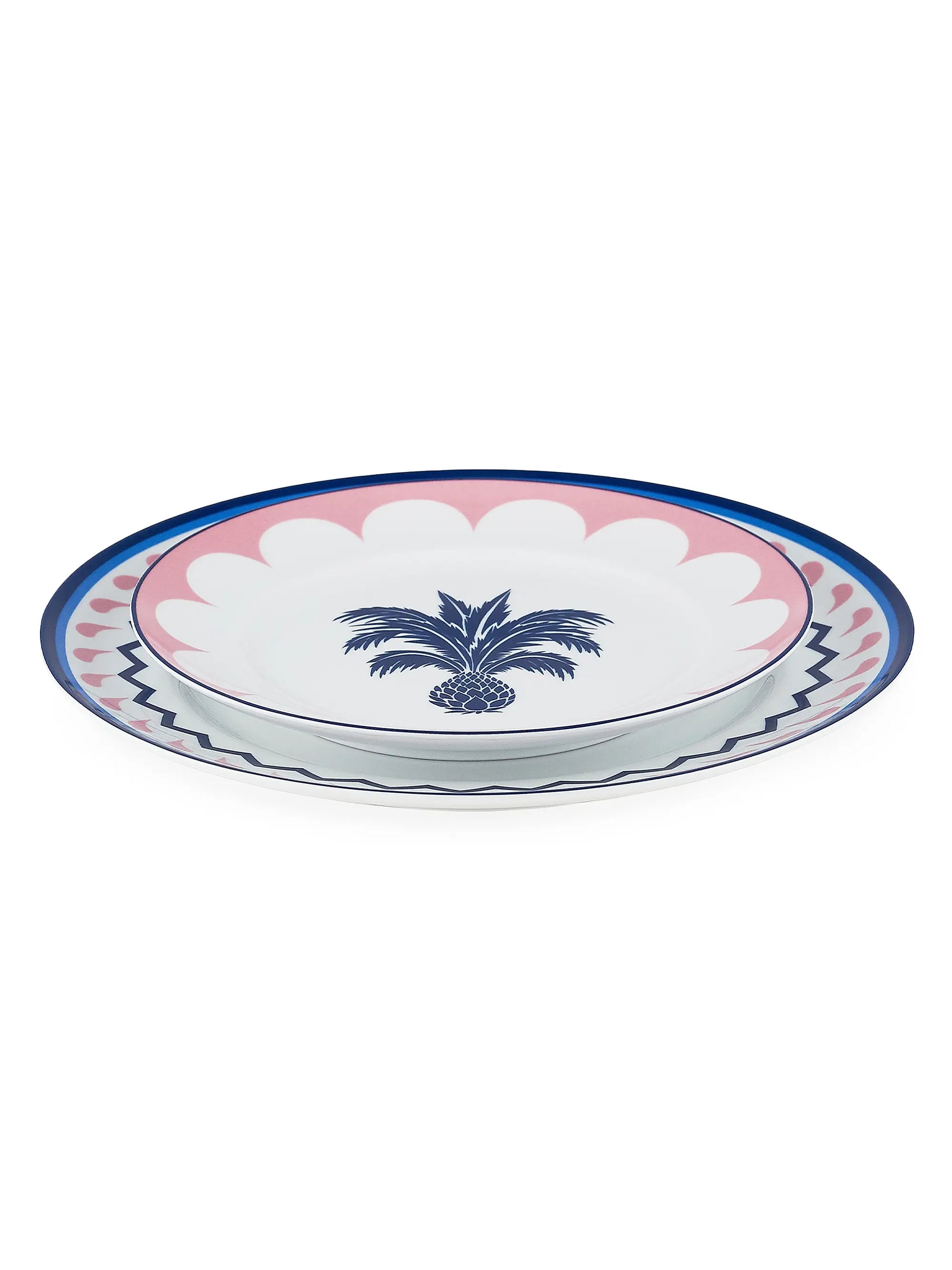 Bring artistry and elegance to any meal with this exquisite set of two porcelain dinner plates. Adorned with lush floral motifs, chevron and stripe accents, and a harmonious pink & blue palette, these plates are designed to elevate your table setting. Inspired by architectural and decorative motifs from classic design traditions, each plate is detailed, vibrant, and visually rich.