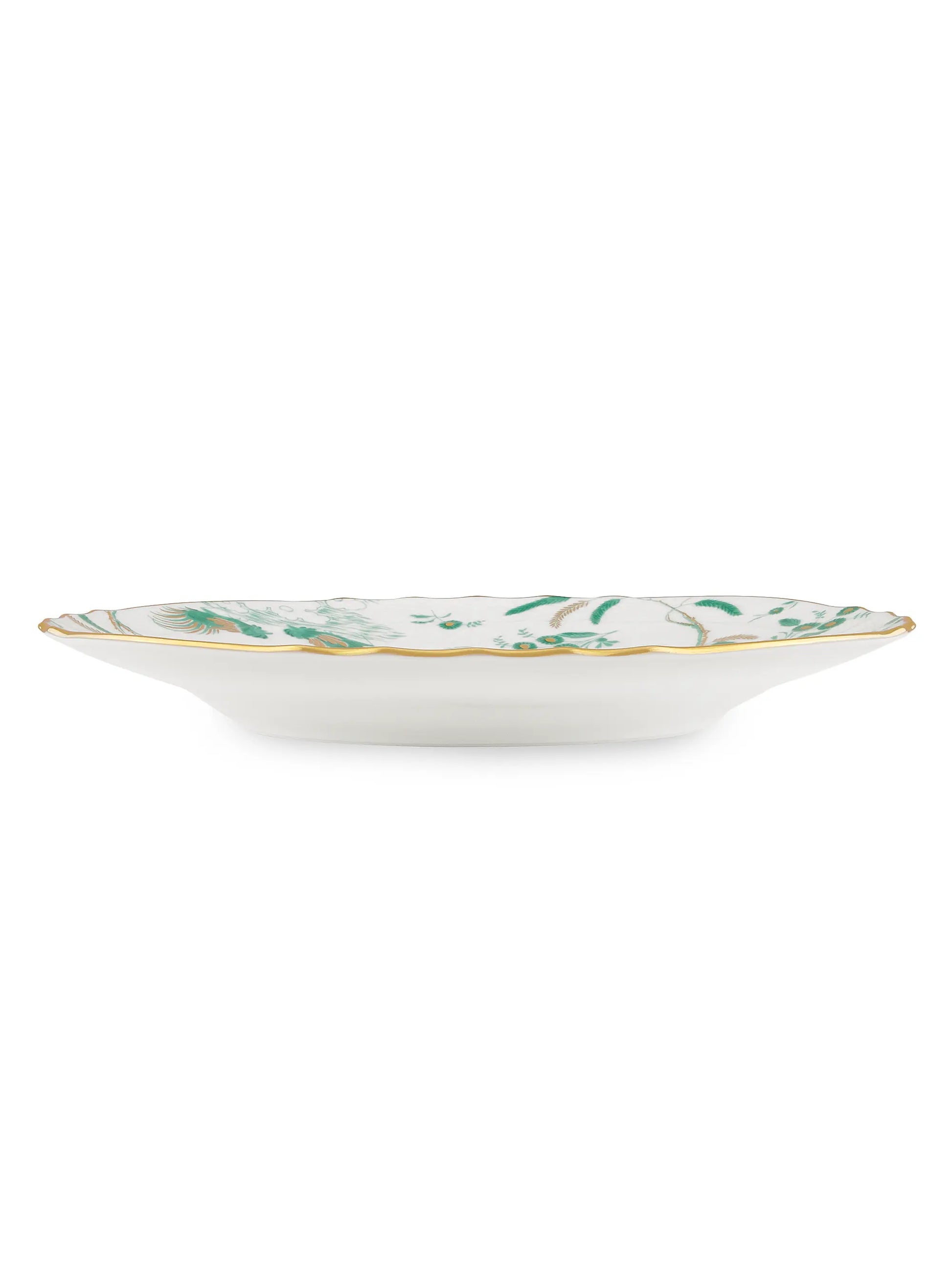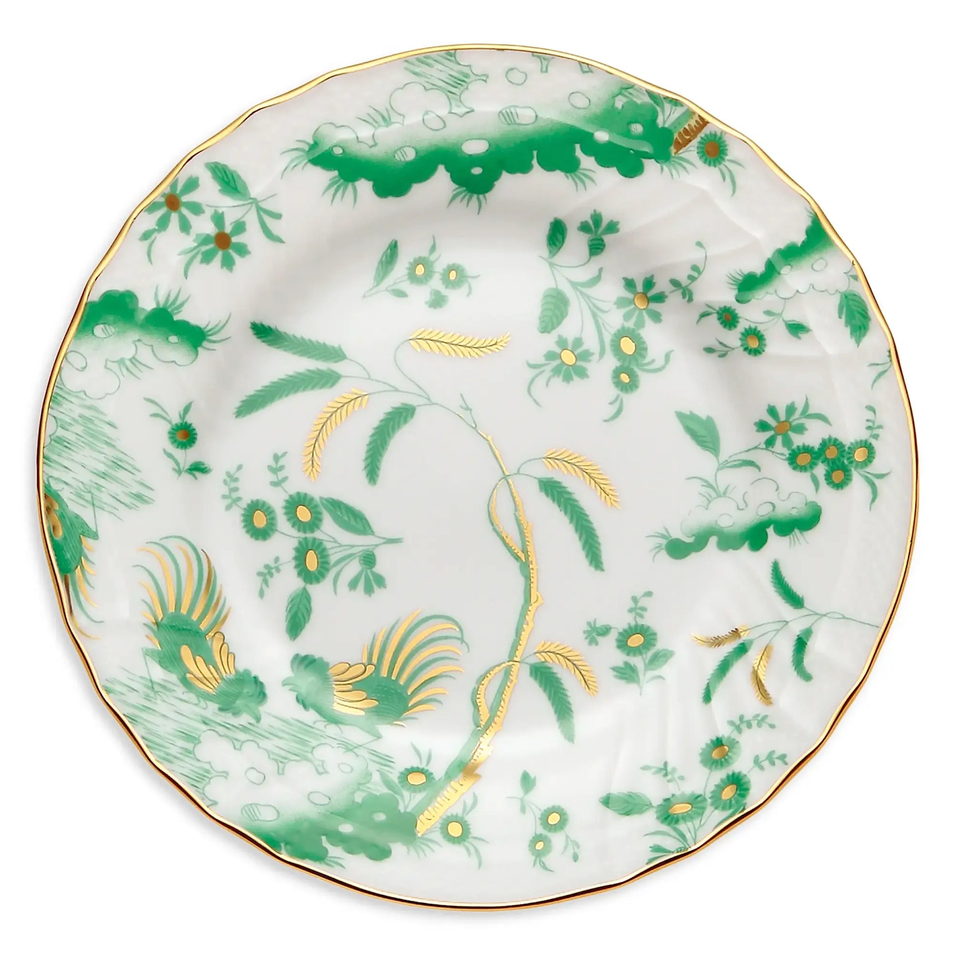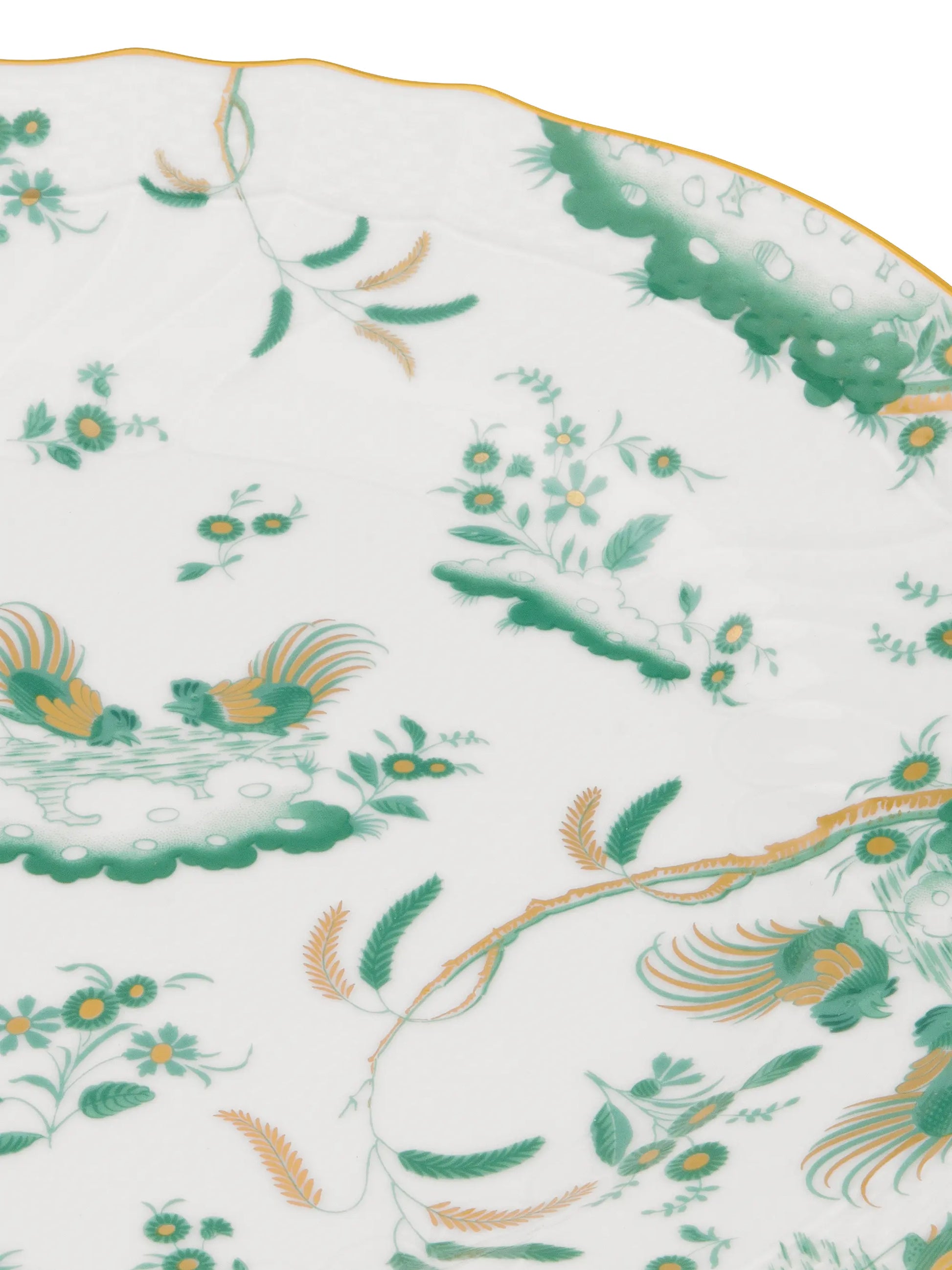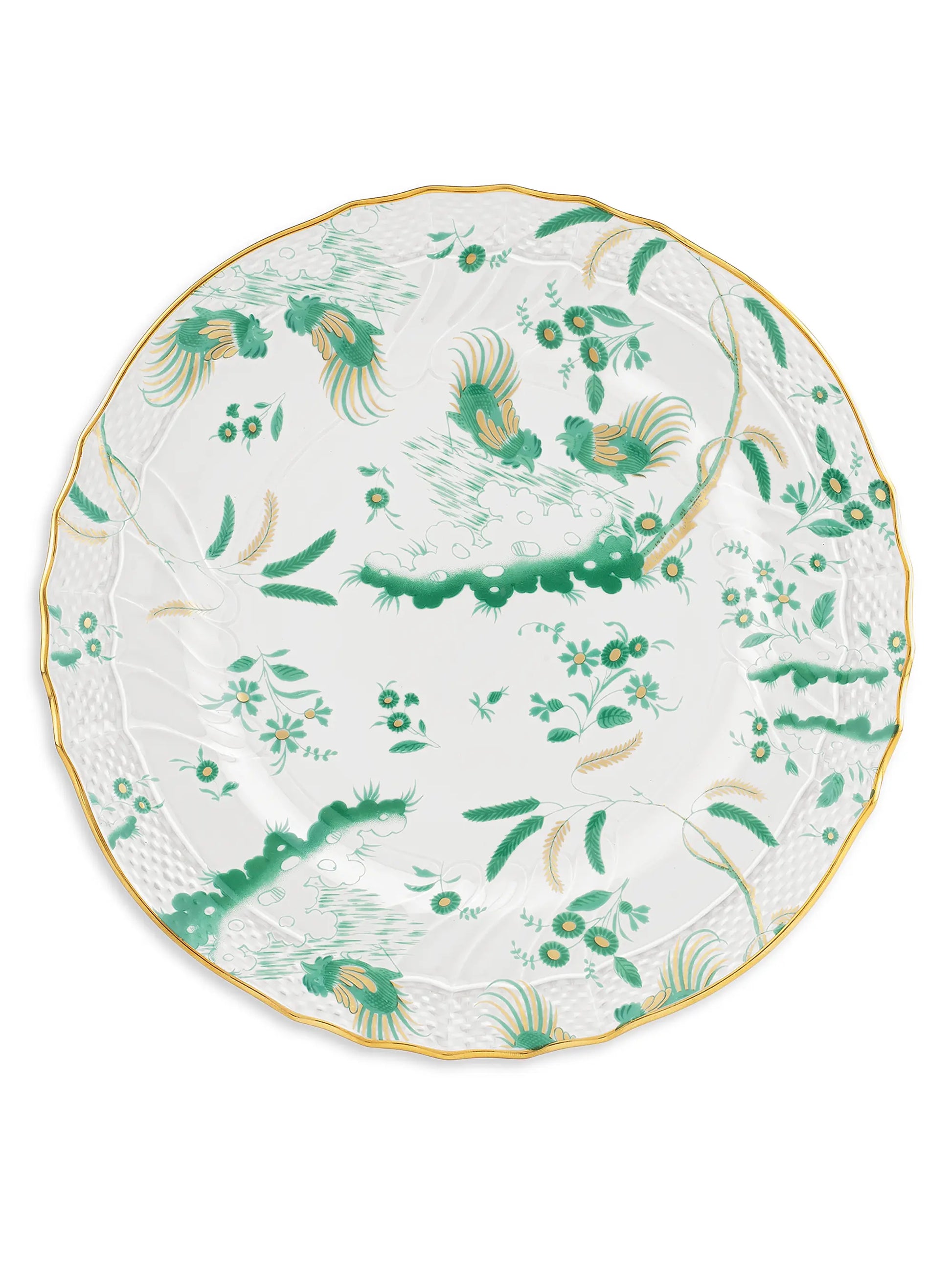 Infuse your table with elegance and legacy using this plate from the Oro di Doccia Giada collection. The vivid jade green decoration, set against lustrous porcelain and edged in hand-applied gold, channels classic Florentine style with a contemporary twist. Inspired by the historic floral hatchings and Ji Ondori rooster motifs, this plate is as much a work of art as it is tableware. A stunning canvas for dinners, salads, or desserts, it elevates every course with refined beauty.