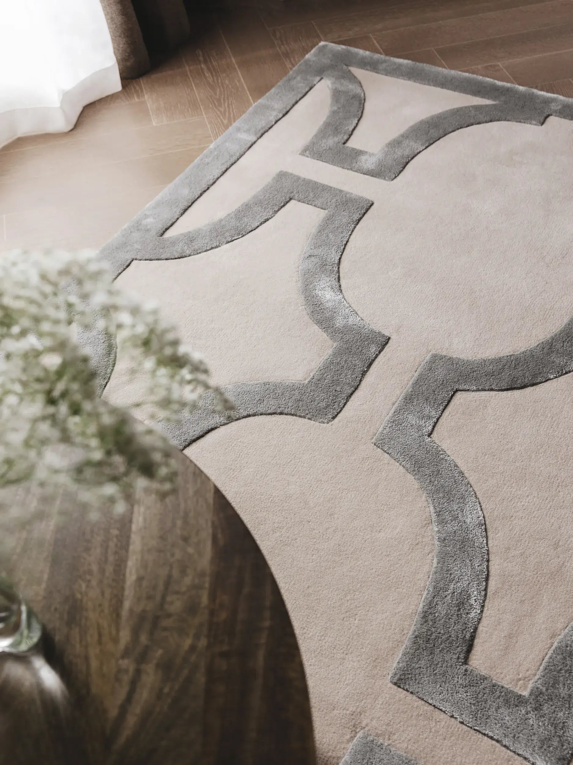 Elevate your home with this refined cream-grey rug crafted from a luxurious wool and lyocell (TENCEL™) blend. Featuring an abstract, sculptural relief design with subtle metallic shimmer, it brings a sense of modern elegance to both minimalist and upscale interiors. The soft cream base tone paired with cool-grey accents offers versatile styling—ideal for living rooms, dining areas, or master bedrooms. Designed to last yet beautiful enough to serve as a focal point, this rug transforms any space into a chic and inviting environment.