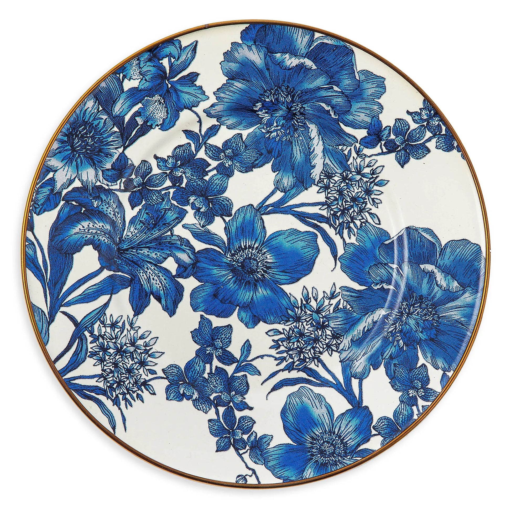 Infuse your table with refined floral elegance using this enamel salad/dessert plate. Featuring a vivid blue floral motif, hand-applied transfers, and a bronzed stainless steel rim, it transforms every dish into a work of art. The durable enamel finish sits on a heavy-gauge steel core, offering both style and function. Dishwasher-safe on a gentle cycle, though not microwave-safe.