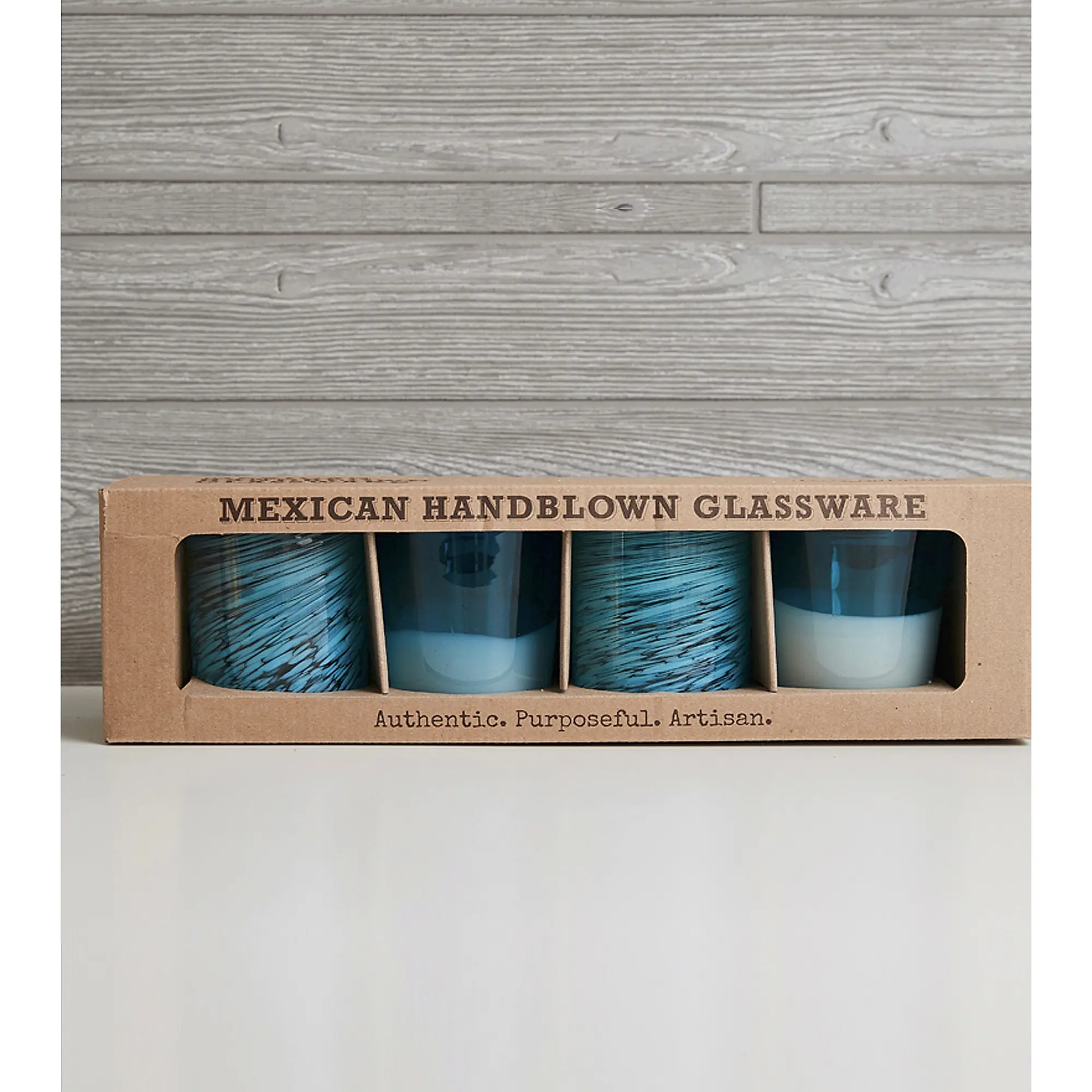 • Set Includes: 4 handblown glasses (2 blue-white gradient, 2 blue swirl)