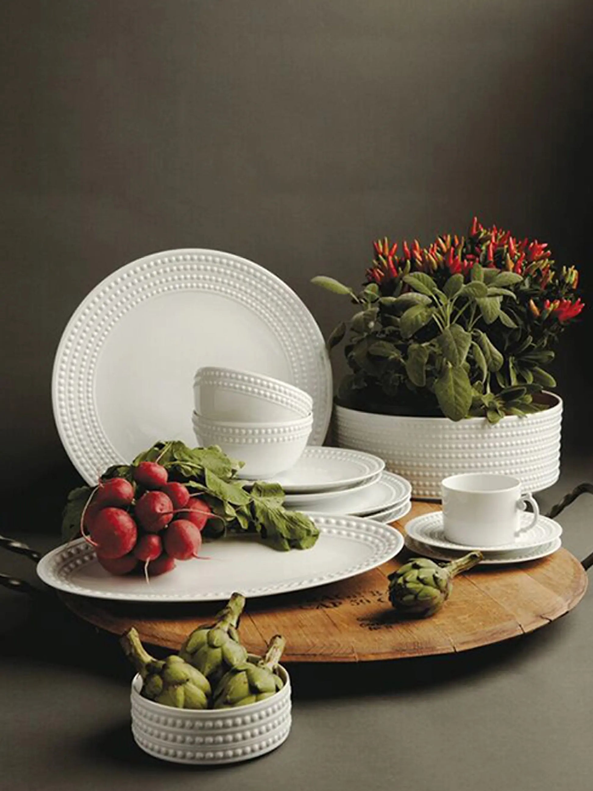 - Raised “pearl” border sculpted around the rim for elegant texture