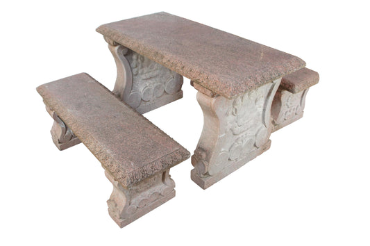Heavy Italian Granite Carved Outdoor Picnic Dining Table & Benches – 50"